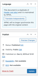 Stap 3: klik op ‘vertaal onafhankelijk’ en sla de pagina op. Hiermee zorg je ervoor dat alle wijzigingen die je nu aanbrengt in de teksten niet meer worden doorgevoerd in de bronpagina.