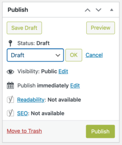 Bewaar de pagina als Draft; als de pagina af is klik je op ‘Publish’. Beiden zijn te vinden onder Publish, rechts boven in het dashboard.