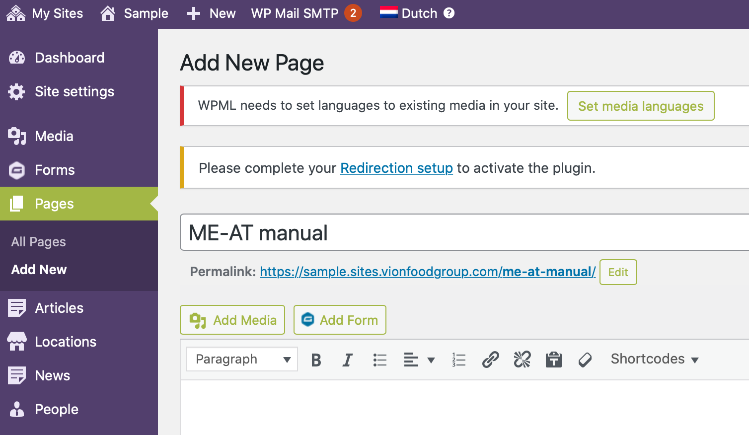 Stap 1: klik op het plusteken bij de gewenste taal rechts boven. Hiermee dupliceer je de pagina (zie afbeelding)