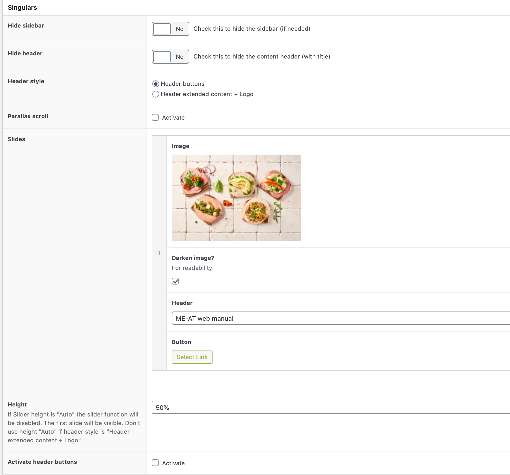 Bij een lichte afbeelding vink je de box ‘darken image’ aan, zodat de header goed zichtbaar is.
