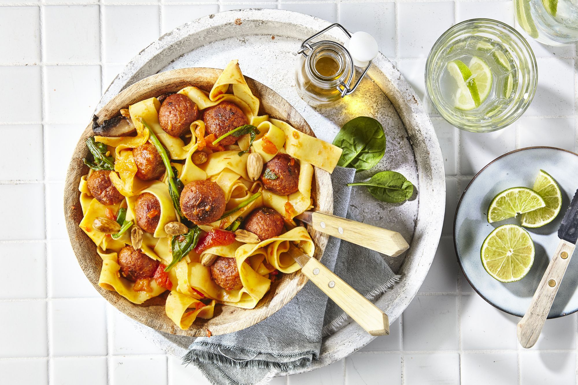 2-kolommenblok: kies voor 50-50% verdeling met een meat-gray achtergrond. In de linkerkolom vul je de ingrediënten in. In de rechterkolom selecteer je de juiste afbeelding.